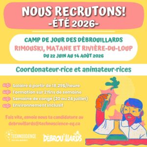 Tu es une personne dynamique passionnée de sciences? Tu veux vivre un été créatif rempli de belles découvertes? Offre toi une saison estivale unique en rejoignant l’équipe des Débrouillards!