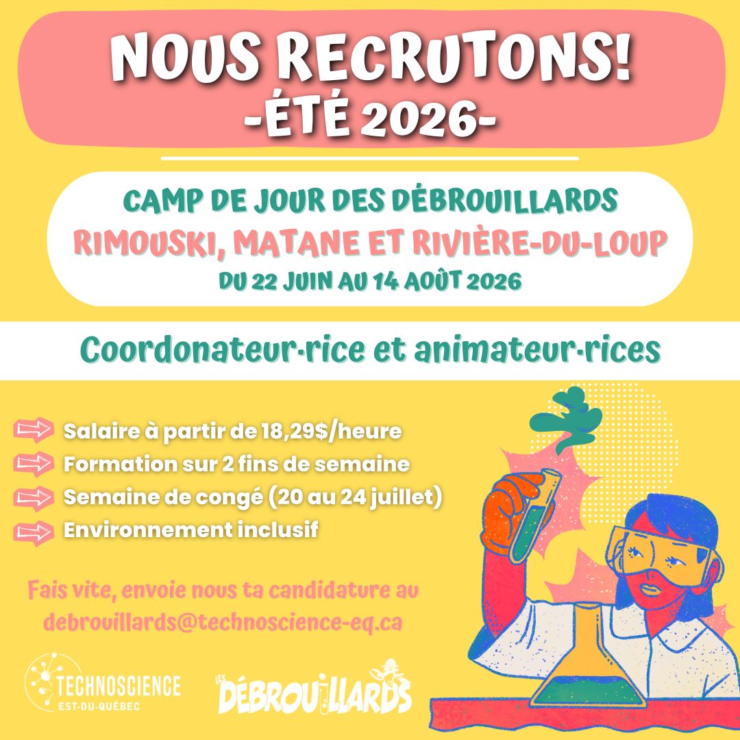 Tu es une personne dynamique passionnée de sciences? Tu veux vivre un été créatif rempli de belles découvertes? Offre toi une saison estivale unique en rejoignant l’équipe des Débrouillards!